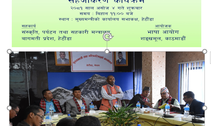 भाषा आयोग काठमाडौँ र संस्कृति, पर्यटन तथा सहकारी मन्त्रालय बागमती प्रदेश सहकार्यमा आयोजित “सरकारी कामकाजमा मातृभाषाः बहुभाषिक शिक्षाको नमुना विकाससम्बन्धी कार्यक्रम” २०८१/६/४ गते सम्पन्न भएको छ। बामगती प्रदेशमा तामाङ र नेपालभाषालाई सरकारी कामकाजमा कार्यान्वयन गर्न गठित कार्यदलको प्रतिवेदन, २०८१ को प्रस्तुति र मन्त्रिपरिषदबाट पारित गरेर कार्यान्वयन गर्नको सहजीकरण गर्न उद्देश्यका साथ यस कार्यक्रमको आयोजना गरिएको थियो ।